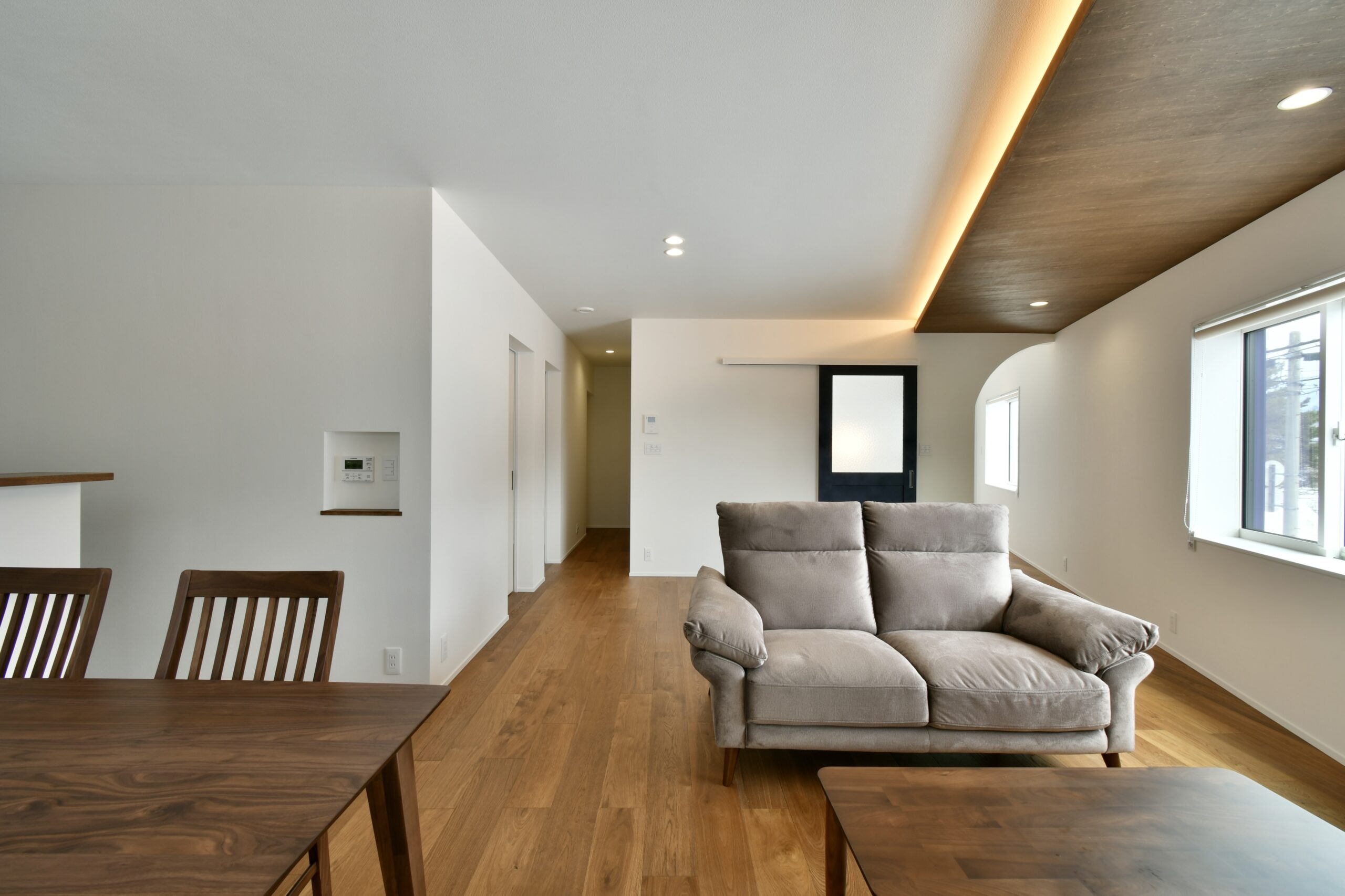 広々した2階リビング、借景を楽しむ窓、